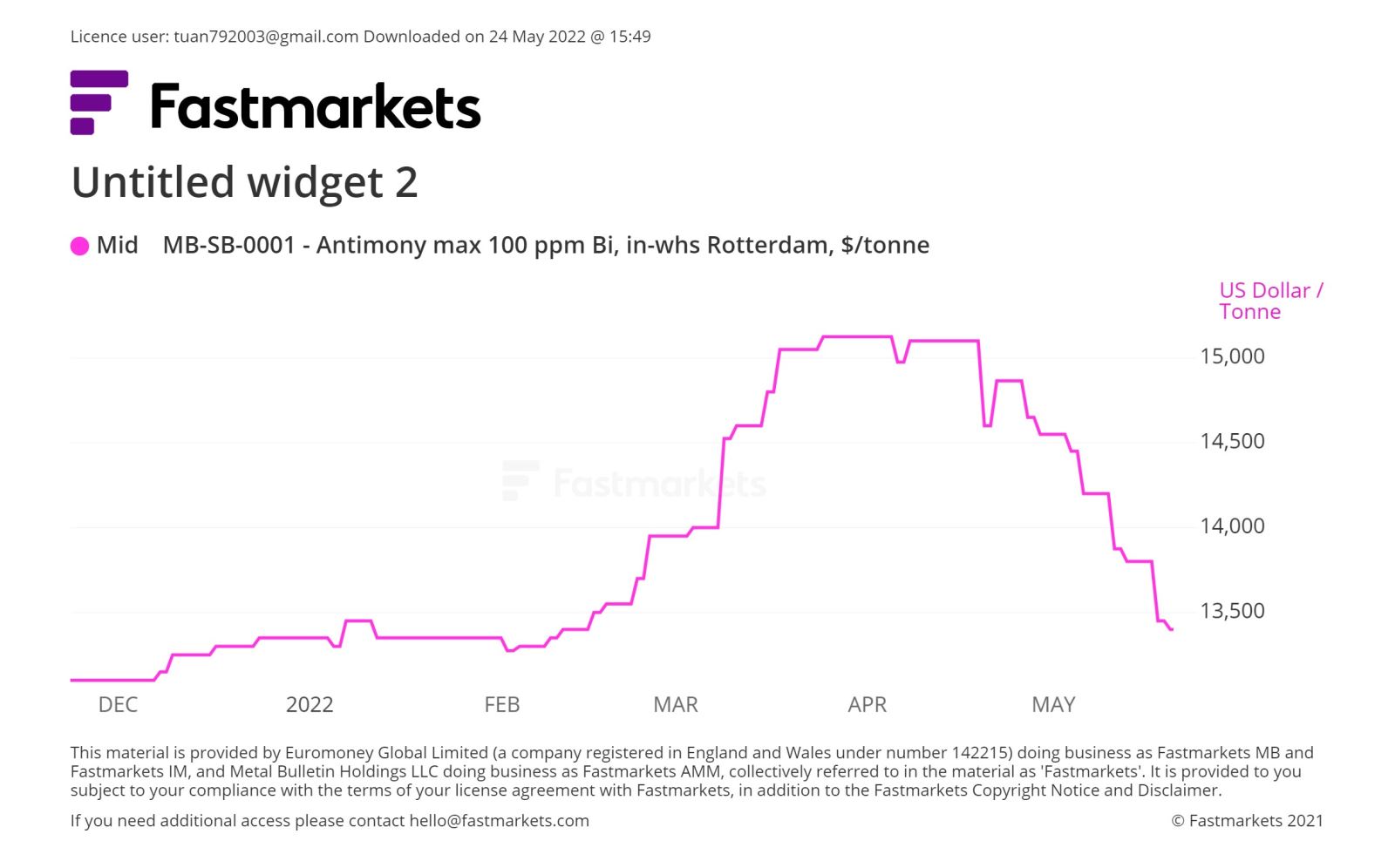 Biểu đồ 2: Biến động giá Antimony loại I 6 tháng gần đây tại thị trường Rotterdam