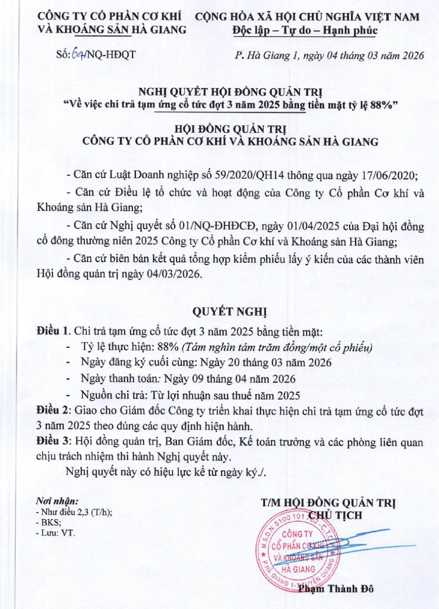 Nghị quyết về việc chi trả tạm ứng cổ tức đợt 3 năm 2025 bằng tiền mặt